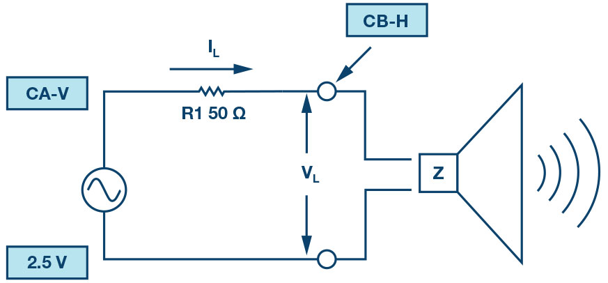 Channel B again measures the voltage VL across the speaker. The impedance analyser software uses the difference between the Channel A voltage and Channel B voltage, as well as the relative phase between the channels to calculate the impedance based the value of the combined R1 and R2.
