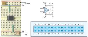Insert the op amp into your breadboard and add the wires and supply capacitors, as shown in Figure 1. To avoid problems later, you may want to attach a small label to the breadboard to indicate which rails correspond to +Vp, –Vn, and ground. Colour coding your wires red for Vp, black for Vn, and green for ground can also help to keep the connections organised.