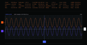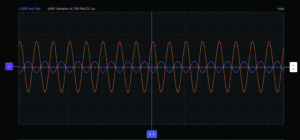 Use the first waveform generator as source VIN to provide a 2V amplitude, 1kHz sine wave excitation to the circuit. Configure the scope so that the input signal is displayed on Channel 2 and the output signal is displayed on Channel 1. Export a plot of the two resulting waveforms and include it in your lab report, noting the parameters of the waveforms (peak values and the fundamental time period or frequency). Your waveforms should confirm the description of this as a unity-gain or voltage follower circuit.