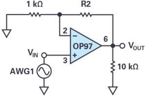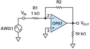 Now change the feedback resistor R2 in Figure 8 from 4.7kΩ to 10kΩ. What is the gain now? Slowly increase the amplitude of the input signal to 2V and export the waveforms into your lab notebook. The output voltage of any op amp is ultimately limited by the supply voltages, and in many cases the actual limits are much smaller than the supply voltages due to internal voltage drops in the circuitry. Quantify the internal voltage drops in the OP97 based on your measurements.