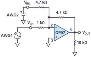 With the power turned off, modify your inverting amplifier circuit as shown in Figure 12. Use the second waveform generator output for VIN2. Turn the amplitude all the way to zero so that you can adjust up from zero during the experiment.