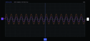 Apply a 2V amplitude, 1kHz sine wave at the input, and display both input and output on the scope. Measure the voltage gain of this circuit and compare it to the theory discussed before. Export a plot of the waveforms and include it in your lab report.