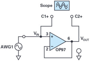 Using your breadboard and the ADALM2000 power supplies, construct the circuit shown in Figure 3. Note that the power connections have not been explicitly shown here; it is assumed that those connections must be made in any real circuit (as you did in the previous step), so it is unnecessary to show them in the schematic from this point on. Use jumper wires to connect the input and output to the waveform generator and oscilloscope leads. Don’t forget to ground the scope negative input leads C1– and C2– (ground connections are not shown in the schematic).
