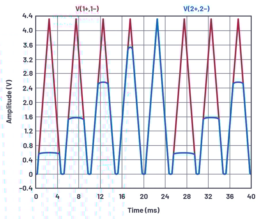 Figure 6. Current mirror waveforms, W1 at 200Hz, W2 at 40Hz, as shown in an LTspice plot.