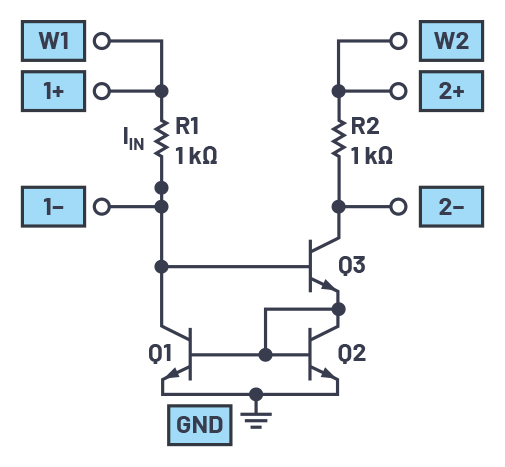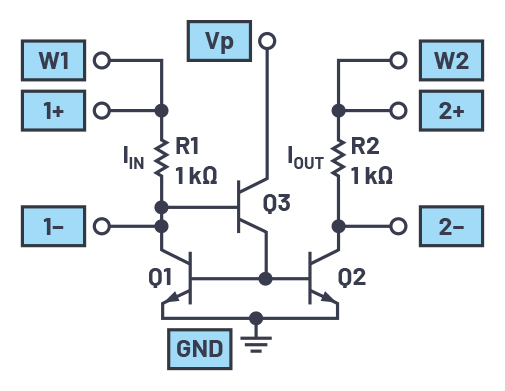 A Wilson current mirror or Wilson current source, named after George Wilson, is an improved mirror circuit configuration designed to provide a more constant current source or sink. It provides a much more accurate input to output current gain. Modify the simple mirror into a Wilson current mirror, as shown in Figure 10.
