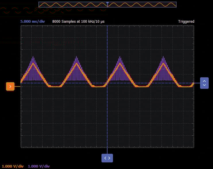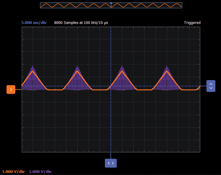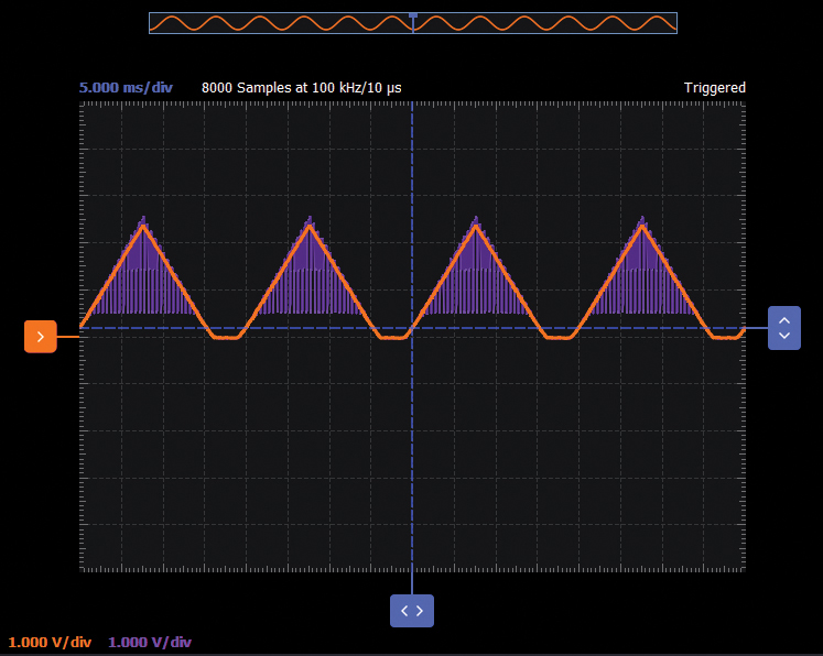 Configure the oscilloscope instrument to capture several periods of the input signal and the output signal.