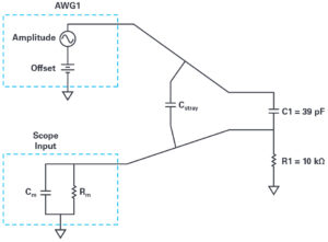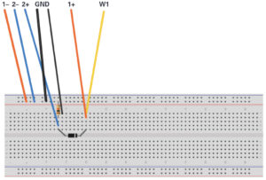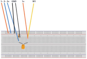 Build the test setup as shown in Figure 2 and Figure 3 on your solderless breadboard. The first step is to measure the unknown capacitance Cm with the known C1 we connected between the AWG output and scope input. The two scope minus inputs 1– and 2– are both grounded. The scope channel 1+ input is tied to the AWG1 output, W1, using one row on the breadboard. Scope channel 2+ is inserted into a breadboard row 8 to 10 rows away from the row that the AWG output is inserted in. The row adjacent to scope channel 2+ and toward the AWG1 row is grounded. This is to minimise any unwanted stray coupling between AWG1 and scope channel 2. Because the fly-wires are not shielded, try to keep the W1 and 1+ wires as far away from the 2+ wires as possible.