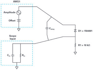 Now we will measure the capacitance of the various diodes from the ADALM2000 analogue parts kit under a range of reverse bias conditions. Build the test setup as shown in Figure 4 and Figure 5 on your solderless bread board. Simply replace C1 with D1, a 1N4001. Be sure to insert the diode with the correct polarity such that a positive offset in AWG1 will reverse bias the diode.