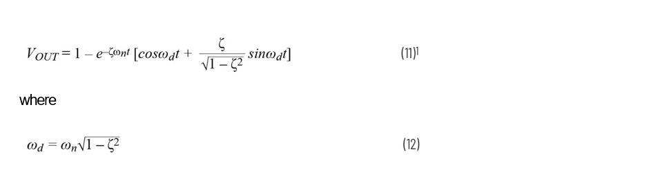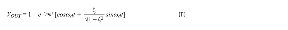 We can see that if the damping coefficient is increased to unity, the damped natural frequency reduces to zero. This is known as the point of critical damping, where all oscillation in the circuit stops. This can also be seen in Equation 11. Since the damped natural frequency, ωd, has reduced to zero, the sine term equates to zero, the cosine term equates to unity, and the expression simplifies to a first-order system – identical to a capacitor charging through a resistor.