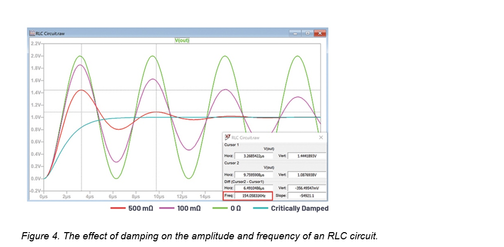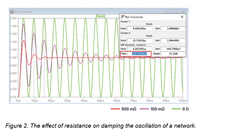 Figure 2 shows an RLC circuit excited with a 1V step input with values L = 1µH and C = 1µF, and resistances of 0Ω, 100mΩ, and 500mΩ. The circuit oscillates at a frequency of 159kHz, as expected. The effect of increased resistance on decay is clear.