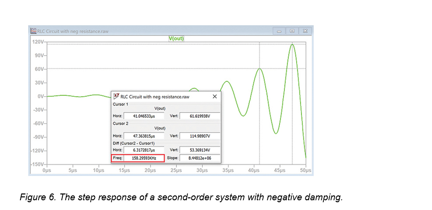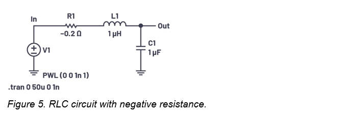Since all circuits possess resistance, many electronic control circuits are inherently stable with poles lying in the left-half plane. However, from Equation 11, a negative damping coefficient causes an exponentially growing amplitude response, so poles lying in the right-half plane cause instability. With circuit simulation, it is easy to see the effect of a right-half plane pole by inserting a negative resistance. Figure 5 shows an RLC circuit, but where the resistance is negative.