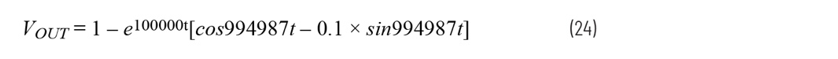Equation 11 tells us how the circuit in Figure 1 responds to a step input. We can see that the waveform has a sinusoidal-like nature and its amplitude is modulated by the term e–ζωnt, which decays or grows exponentially depending on whether the damping coefficient is positive or negative. As an approximation, we can see that the response consists of a sinusoidal part and a cosinusoidal part, but, for low damping coefficients, the sinusoidal part is small.