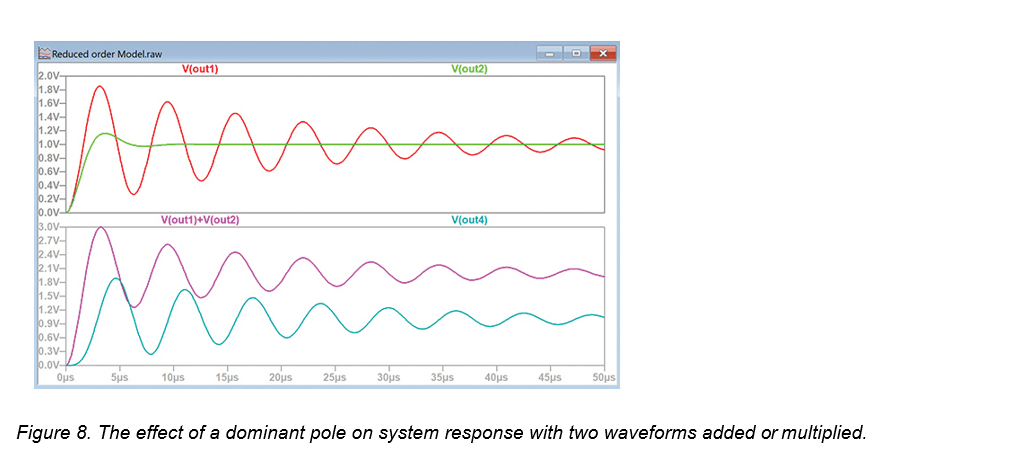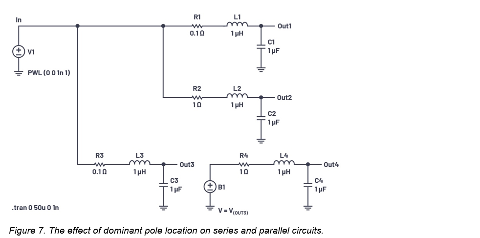 We can see their responses in Figure 8. Unsurprisingly, the circuit with the largest resistance has the largest damping coefficient, hence its oscillation decays the quickest, as seen in the plot of V(OUT2). However, we notice that when both outputs are either added (putting the circuits in parallel), or multiplied (putting the circuits in series), V(OUT1) dominates the response. Therefore, one way to simplify a complex system is to focus on the circuit that has poles closer to the jω axis, which tends to dominate the system response.