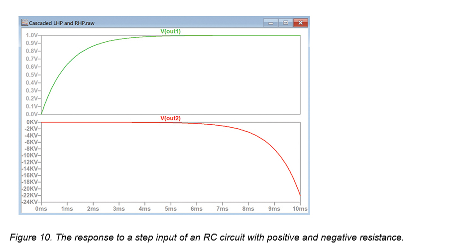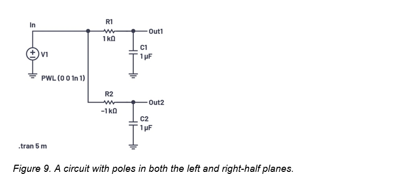 Referring again to Equation 11, it is the exponent that determines if the system is stable. We can ignore the sinusoidal part of Equation 11 and just look at the exponents to see what happens if we combine a left-half pole with a right-half pole. Figure 9 shows a simple circuit to demonstrate this.