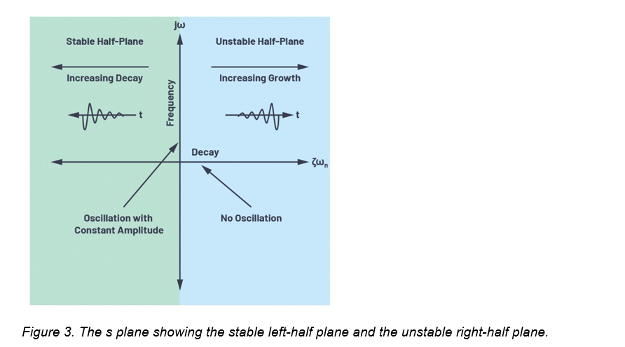Control theory states that a system is stable if the poles lie in the left half of the s plane. Figure 3 shows an example of the s plane where the real part is plotted on the x-axis and the imaginary part is plotted on the y-axis.