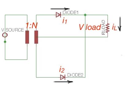The transformer is needed to enlarge or decrease the voltage magnitude before rectification. The second part of a full-wave rectifier includes the diode. This scheme for a full-wave rectifier is characterised by the feature that the positive half-wave of the signal goes through the top diode, that is forward-biased, the negative half-wave of the signal goes through the bottom diode, reverse-biased. For the industrial electrical lines the offset voltage is very small and the diodes can be assumed as ideal ones. So, according to the scheme for a full-wave rectifier we get: iload=NvsourceRload=i1 (vsource>0), iload=i2=NvsourceRload(vsource>0).