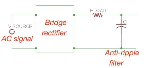 The rectification process described above is widely used. Functionally the schemes are called the DC power supply, because they are used in the process of extracting the DC signal from the former AC signal. After obtaining the DC signal, a DC voltage regulator is used in a circuit to avoid any possible fluctuations of voltage. The DC power supply scheme is depicted below as a block-diagram. The Zenner diode is usually used as a regulator in these schemes, due to its ability to maintain specific voltage level for the range of currents.
