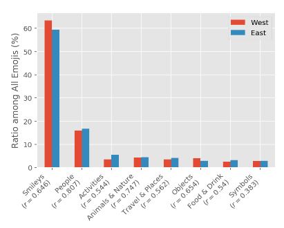 Credit: “Studying cultural differences in Emoji usage across the East and West”, Proceedings of the Thirteenth International AAAI Conference on Web and Social Media (ICWSM 2019), Sharath Chandra Guntuku, Mingyang Li, Louis Tay, Lyle H. Ungar, University of Pennsylvania, Purdue University.”Studying cultural differences in Emoji usage across the East and West”