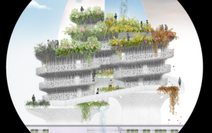 The internal structure resembles that of seashells and accommodates a self-sustaining biosphere. It mimics terrestrial seasons (left to right).