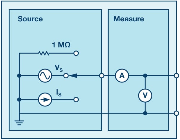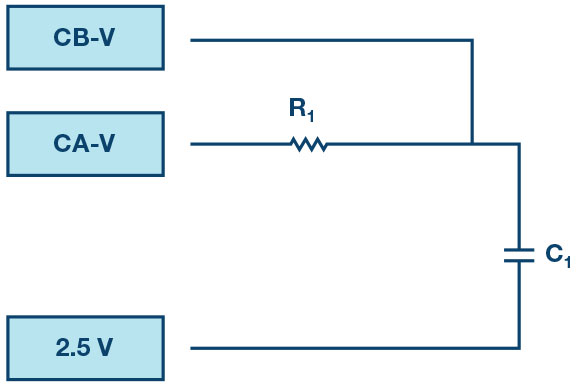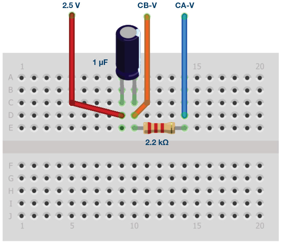 As in all the ALM labs, we use the following terminology when referring to the connections to the ALM1000 connector and configuring the hardware. The green shaded rectangles indicate connections to the ADALM1000 analog I/O connector. The analog I/O channel pins are referred to as CA and CB. When configured to force voltage/measure current, –V is added (as in CA-V) or when configured to force current/measure voltage, –I is added (as in CA-I). When a channel is configured in the high impedance mode to only measure voltage, –H is added (as in CA-H).
