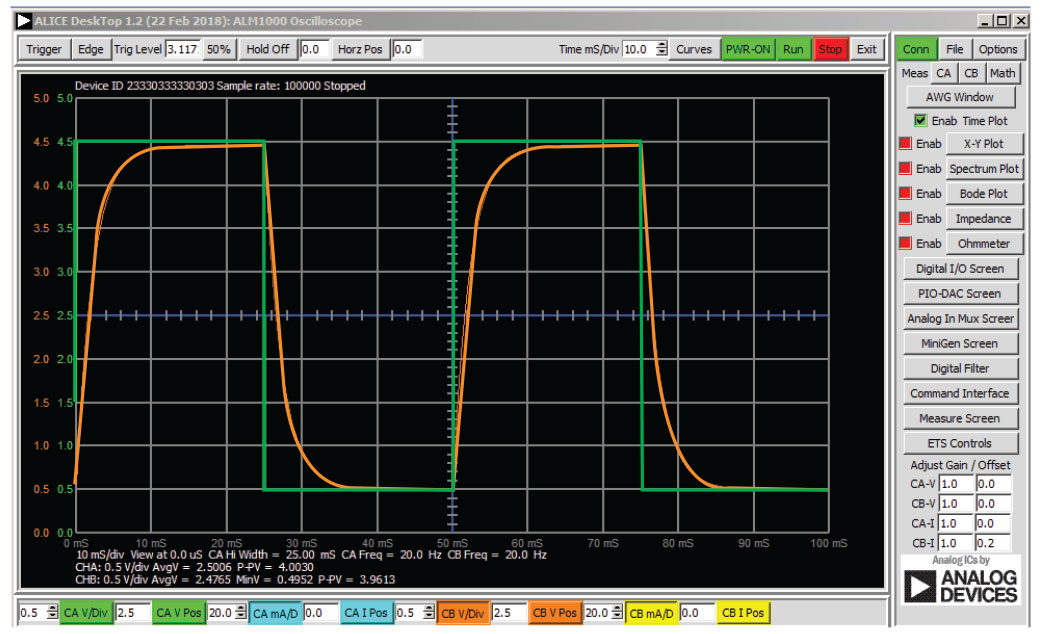 3. From the ALICE Curves drop down menu, select CA-V and CB-V for display. From the Trigger drop down menu, select CA-V and Auto Level. Adjust the time base until you have at approximately two cycles of the square wave on the display grid.