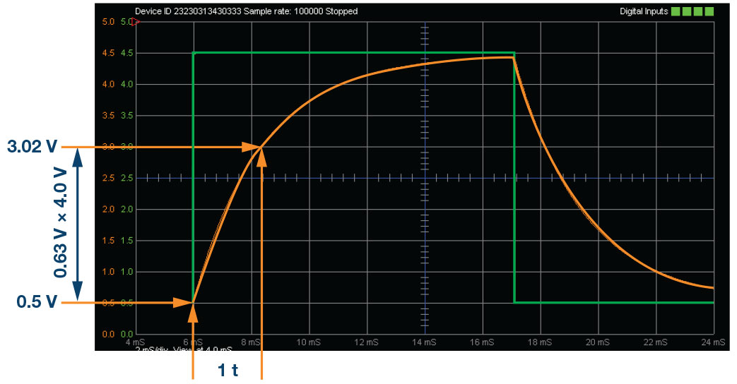 - Calculate the time constant () using Equation 1 and compare it to the measured value from 4b ( and ).
