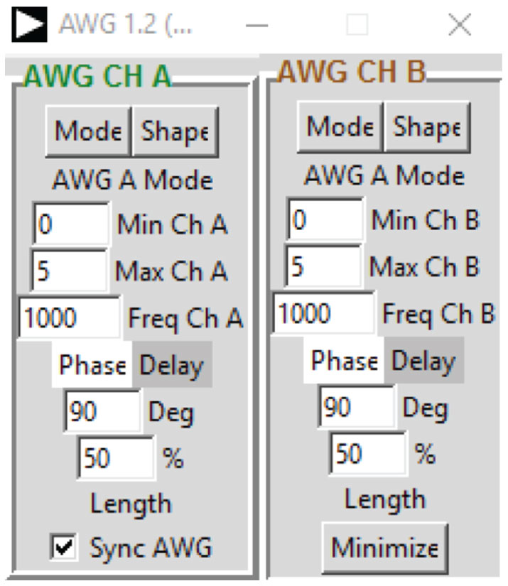 - In the AWG controls window, set the Frequency of CHA and CHB to 1000 Hz with 90° phase, 0 V minimum, and 5 V maximum values (5.000 V peak-to-peak output). Select SVMI mode and the sine waveform.