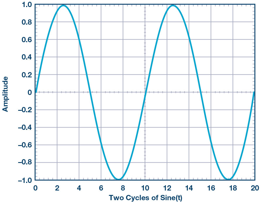 The value of is 0 in the function plotted in Figure 2. Since the , the plot starts at 0. This is a simple sine wave with no offset in time, which means no phase offset. Note that if we are using degrees, goes from 0 to 2π or 0 to 360° to yield the sine wave shown in Figure 2.