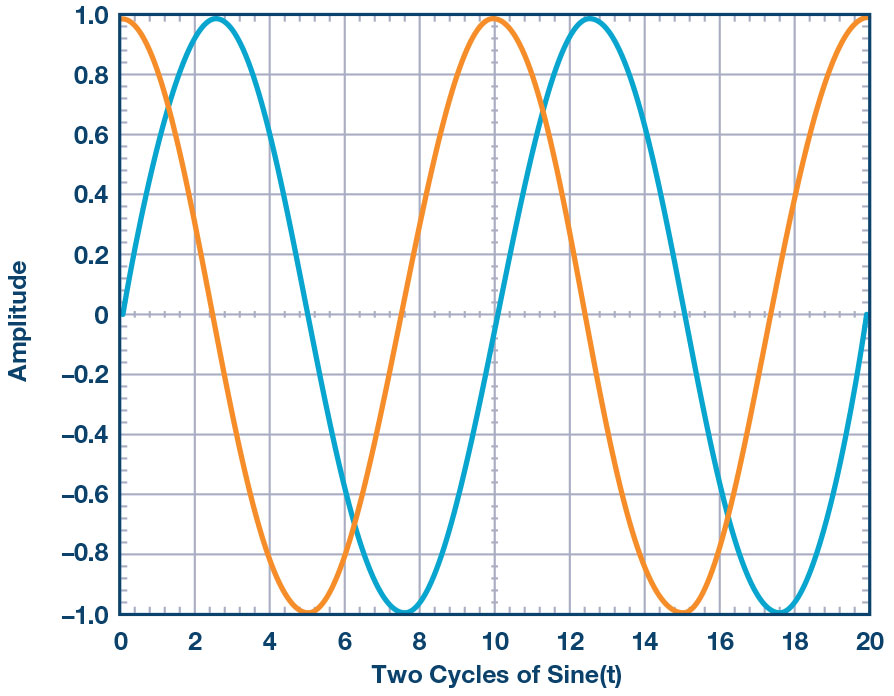 Now change to radians, or 90°, for the second waveform. We see the original sine wave and a sine wave shifted to the left in time. Figure 3 shows the original sine wave (green) and the second sine wave (orange) with an offset in time. Since the offset is a constant, we see the original sine wave shifted in time by the value θ, which in this example is of the wave period.
