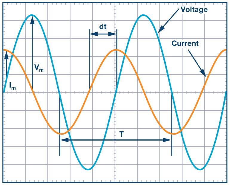 When there are two sine waves displayed, for example, on a scope, the phase angle can be calculated by measuring the time between the two waveforms (negative to positive zero crossings, or rising edges, can be used as time measurement reference points in the waveform). One full period of the sine wave in time is the same as 360°. Taking the ratio of the time between the two waveforms, dt, and the time in one period of a full sine wave, , you can determine the angle between them. Equation 2 shows the exact relationship.
