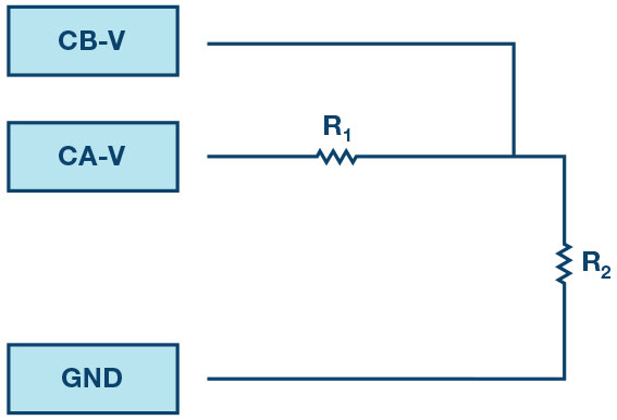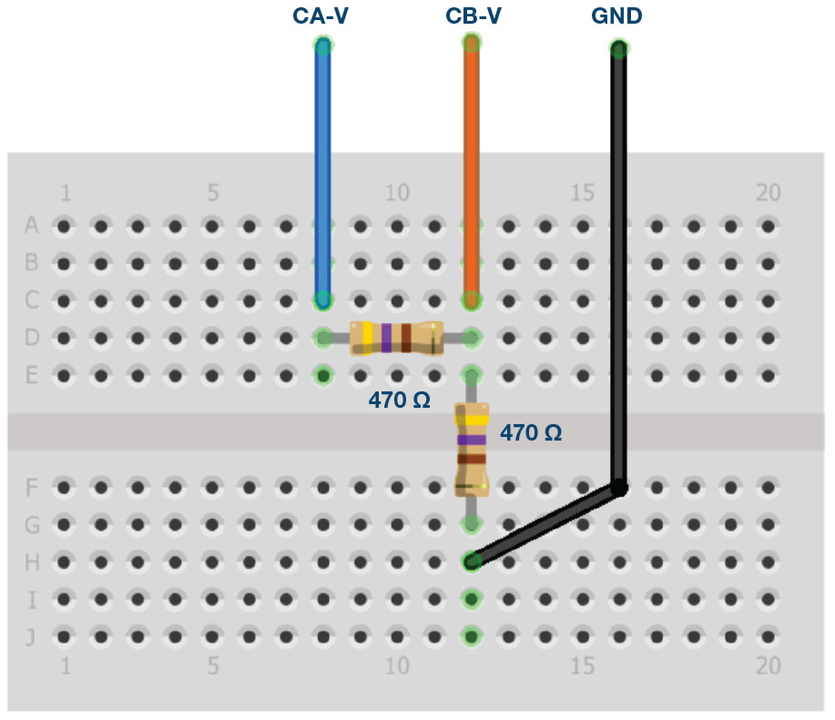 As in all the ALM labs, we use the following terminology when referring to the connections to the ALM1000 connector and configuring the hardware. The green shaded rectangles indicate connections to the ADALM1000 analog I/O connector. The analog I/O channel pins are referred to as CA and CB. When configured to force voltage/measure current, –V is added (as in CA-V) or when configured to force current/measure voltage, –I is added (as in CA-I). When a channel is configured in the high impedance mode to only measure voltage, –H is added (as in CA-H).