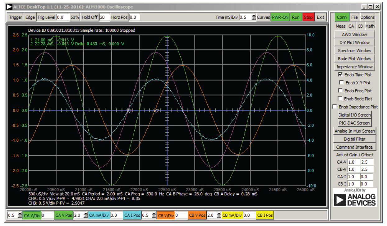 If the board has been calibrated correctly you should see one sine wave on top of the other, with CHA and CHB both equal to 5.00 V p-p. If the calibration isn’t correct, you might see two sine waves in phase with the amplitude of CHA different from CHB. Recalibrate if there is a significant voltage difference.